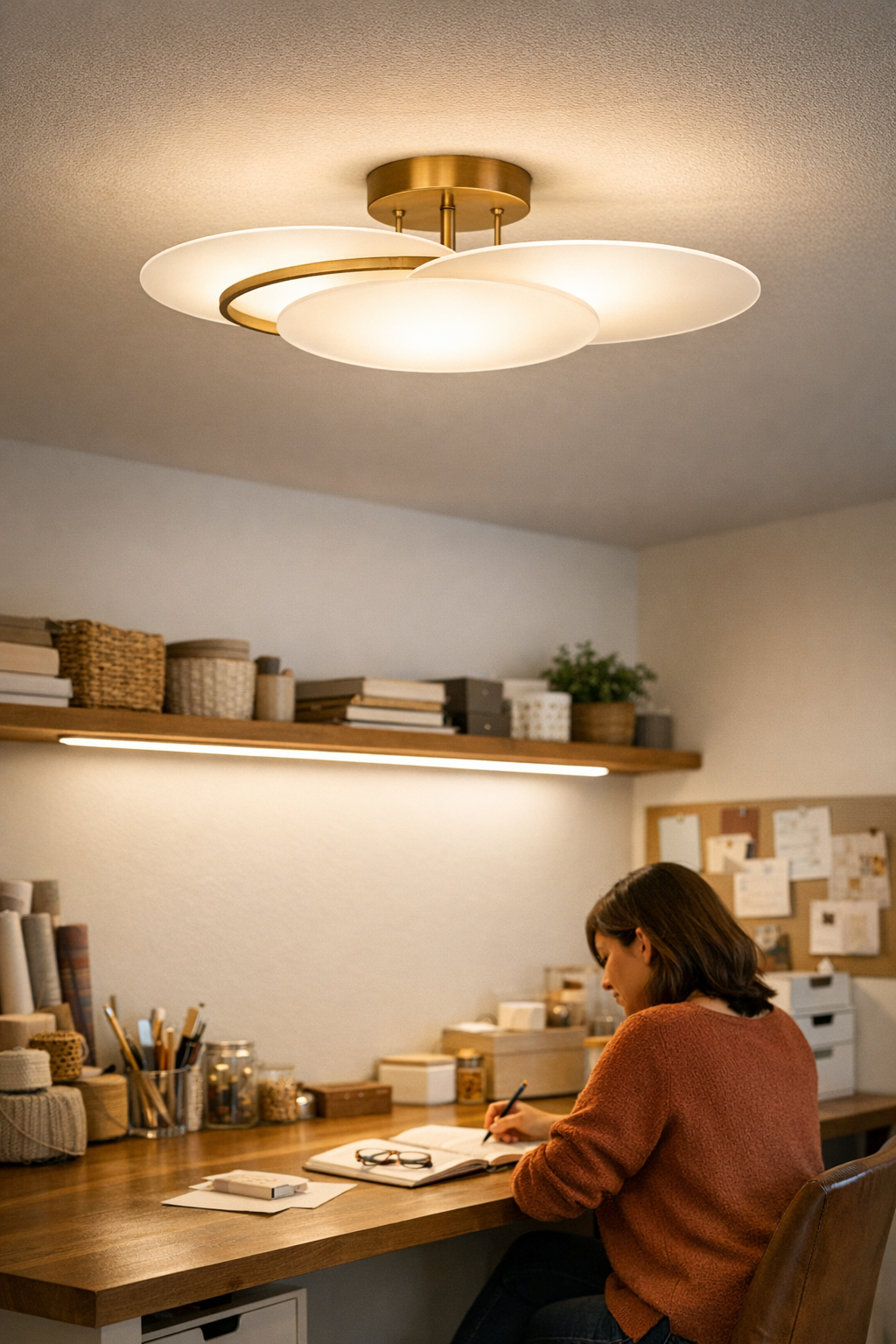 Most standard ceiling lights—centered fixtures, general-purpose pendants, or single-source flush mounts—create presentable symmetry. But as soon as you sit down with your laptop, stack up files along a shared table, or reach for a wall outlet, the setup shows its limits. Shadows snake out along the far side of your desk, the edges of a shelf blur into half-dark, and any device cable left plugged in seems designed to vanish at exactly the worst moment. You end up shifting your chair, tipping screens to dodge a burst of glare, or brushing your hand blindly along the floor for something you dropped—again. Even with visually “clean” cable runs and organized surfaces, too many spaces end up half-lit, constantly forcing micro-adjustments and workarounds: nudging a lamp, shifting your working position, and unconsciously planning your movements to avoid the worst lighting patches.