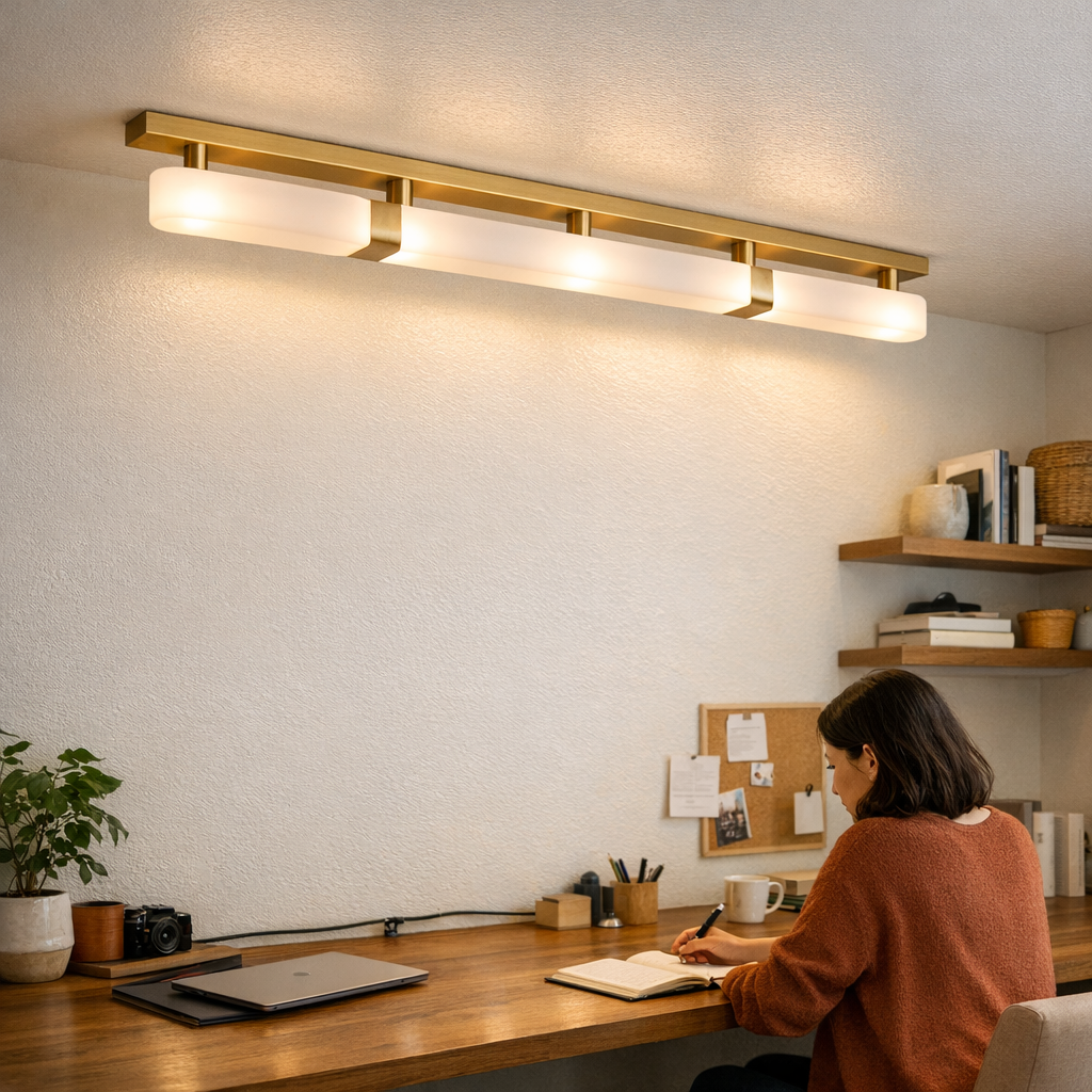 The change is often one move: replace that single central flush mount with a slim linear panel, lining it up above the real working zone. The difference shows up where it counts—no more invisible cable tangle at the edge, no more pens vanishing off the desk, and no more awkward seat-tweaking just to kill a screen glare or chase comfortable light. The quick, repeated frictions—seeking a better angle, retracing the floor twice to pick up a dropped adapter—fade out first. You feel less worn-out at the end of the day not because the room got brighter, but because you stopped fighting against it with every small adjustment.