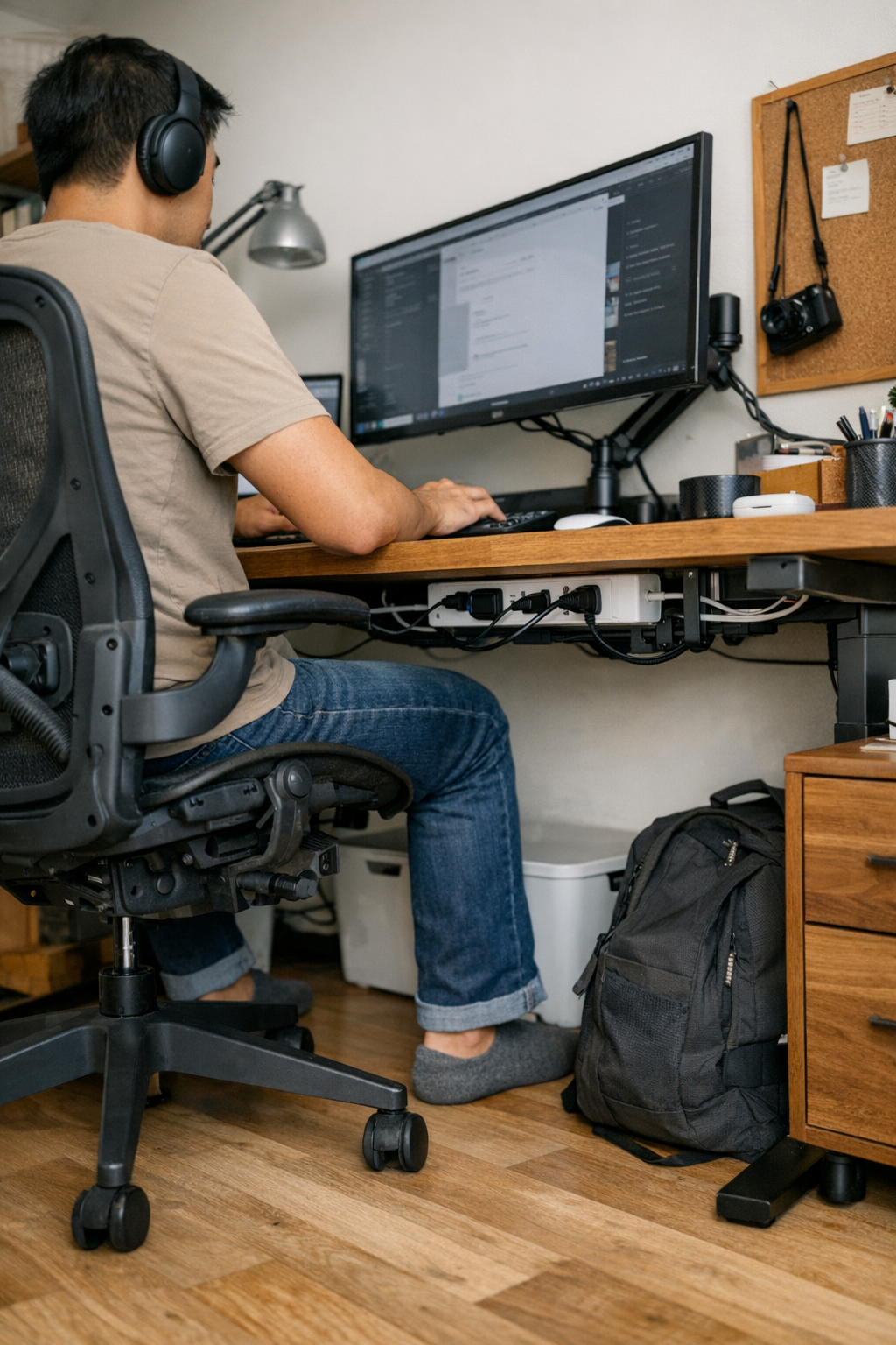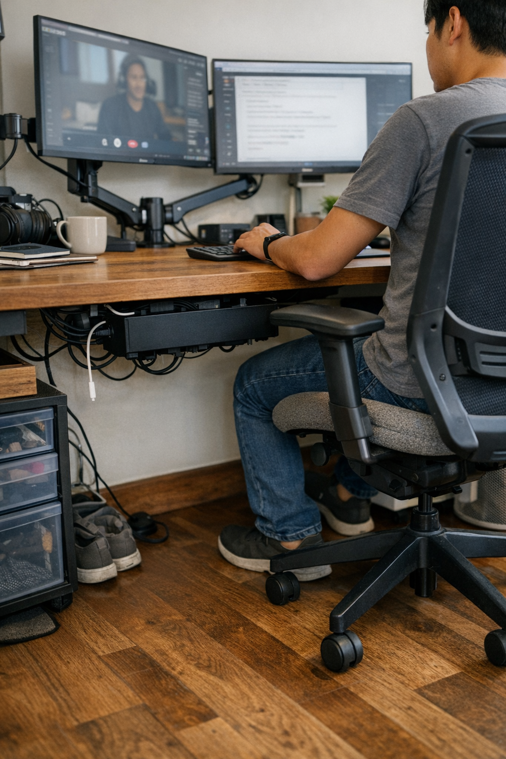Workstations that actually perform—especially over high-repeat sessions—rely on predictability below the desk, not just looks above. The only success test is whether you can slide in, shift leg position, and get up for a break without noticing the storage or the cables at all—every single time. After a day of interrupted resets, or a week of nudging bins to reach the screen, the “neat” desk shows its gaps.