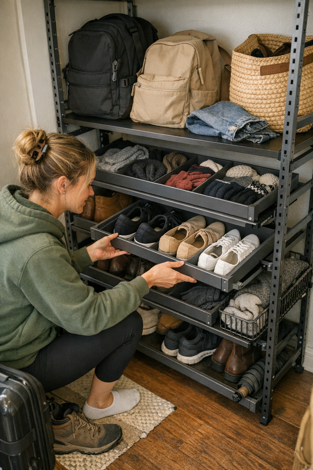 The trouble comes when you’re late and need that one glove. Bins are deep, dark, and deceptively mixed. Search for a scarf, and you pull out hats, a mismatched set of mittens, and maybe last season’s sunscreen. Bins keep strays off the floor, but inside, categories tangle with every hasty grab. And if the shelves are deep, it’s a fishing expedition—everything falls to the bottom, and you’re left sifting blind to locate what you need.