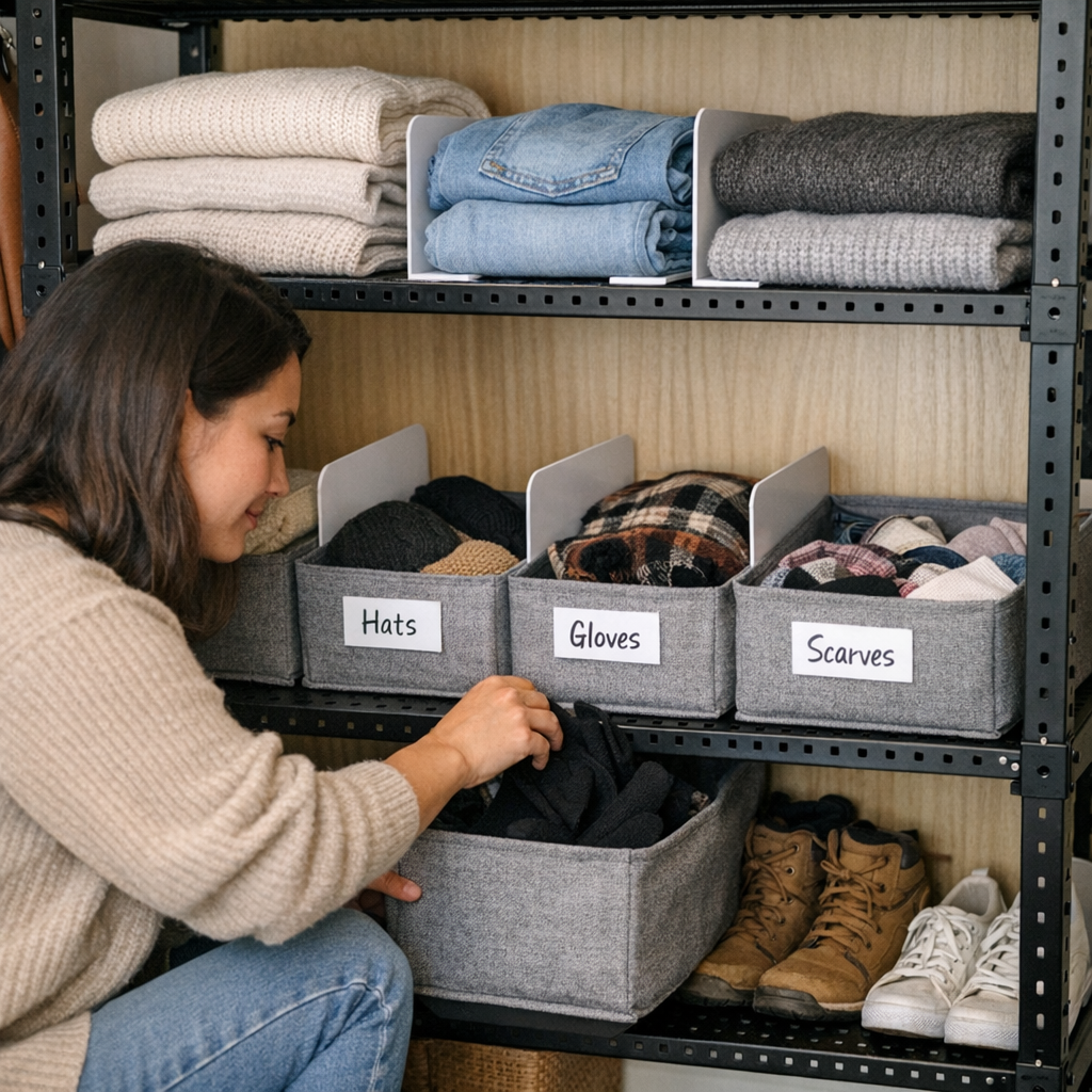 Systems last when they match the mess—not just the mood after a big clean. The game changer: Dividers keep folded piles neat and upright (think: jeans, shirts, towels), while sturdy, clearly labeled bins catch everything loose and unstackable (gloves, scarves, belts). Give each bin one job, tape on a label (“winter scarves,” “kiddo hats”), and stick to it. That small clarity is what prevents the daily reshuffling and keeps your categories from turning into catch-alls.