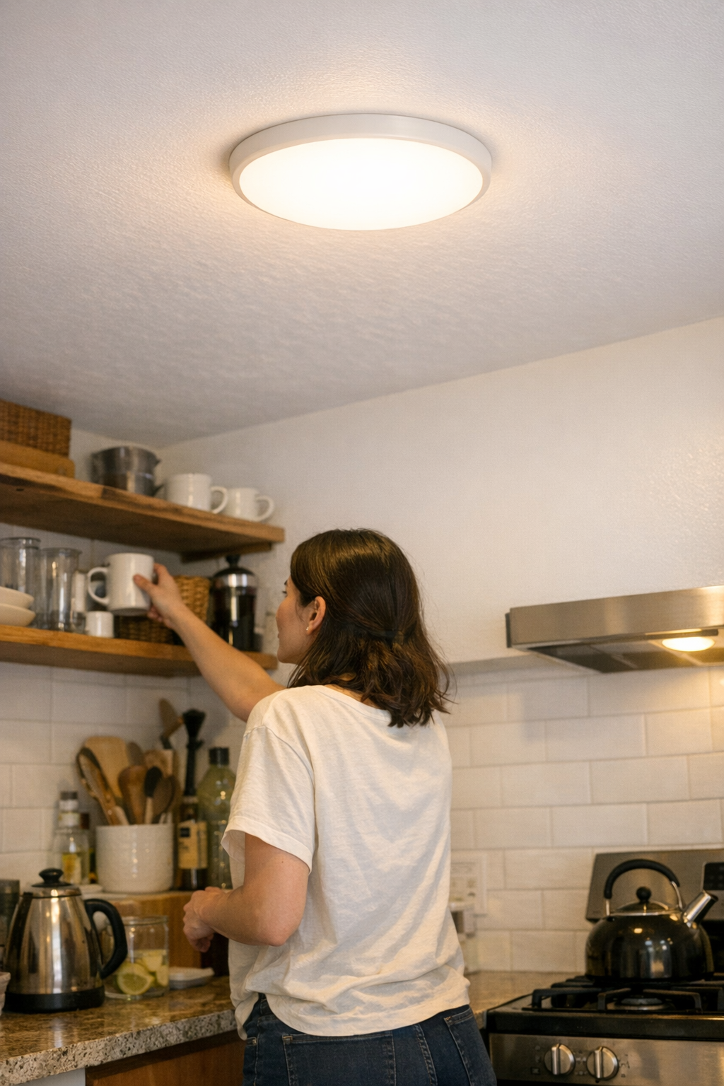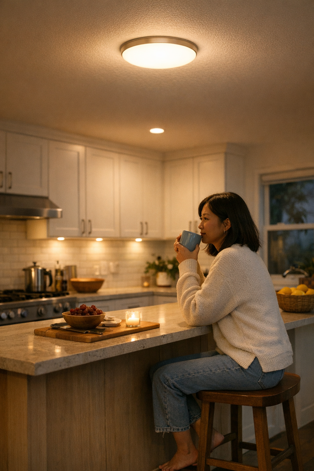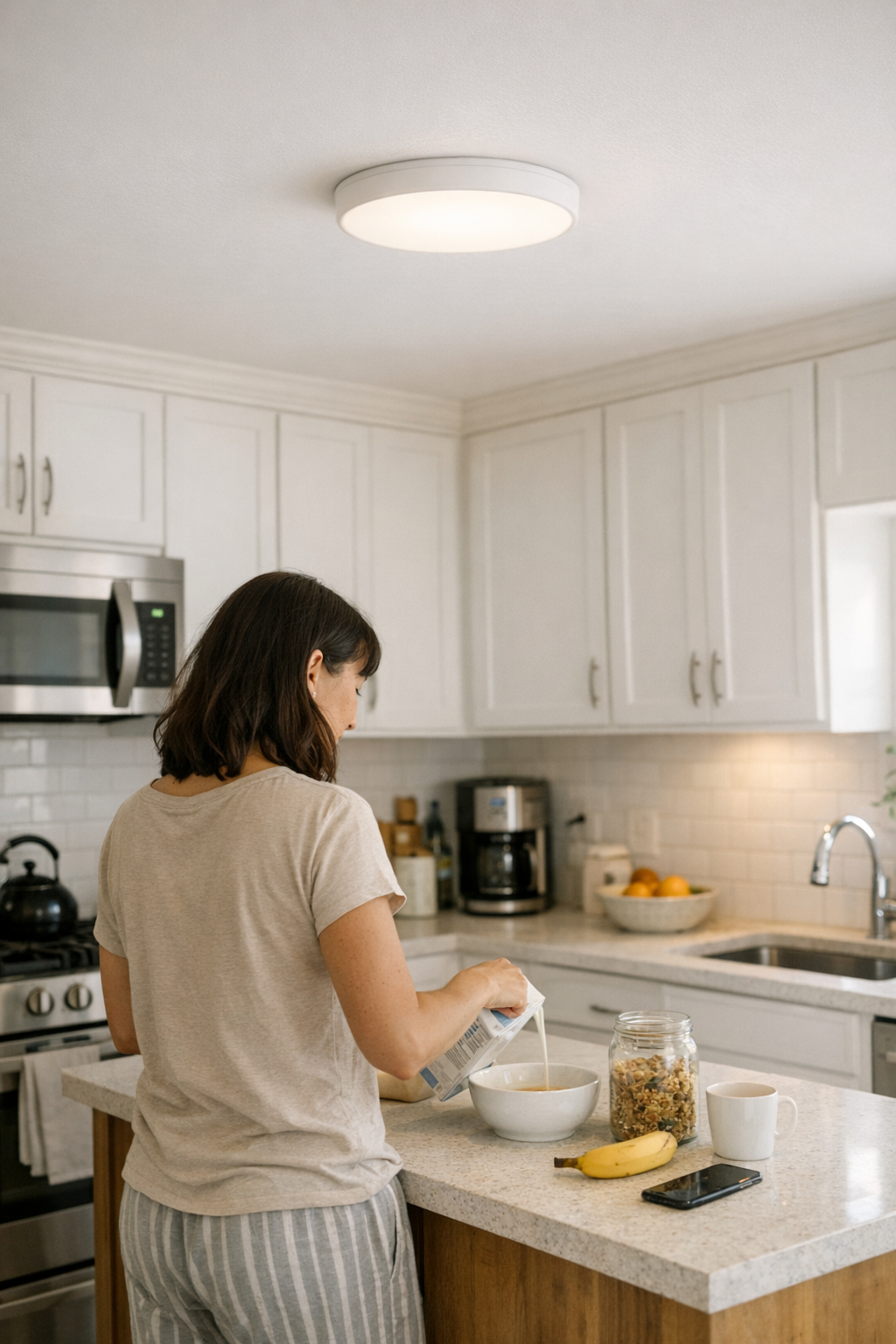 Imagine a morning when the family is moving quickly through the house. Someone’s rushing to the kitchen, another is balancing a laundry basket, kids are scrambling for their shoes. In the past, the low-hanging light bulb might have caused a harsh, glaring spot that makes it hard to open eyes fully or forced moments of awkward ducking.