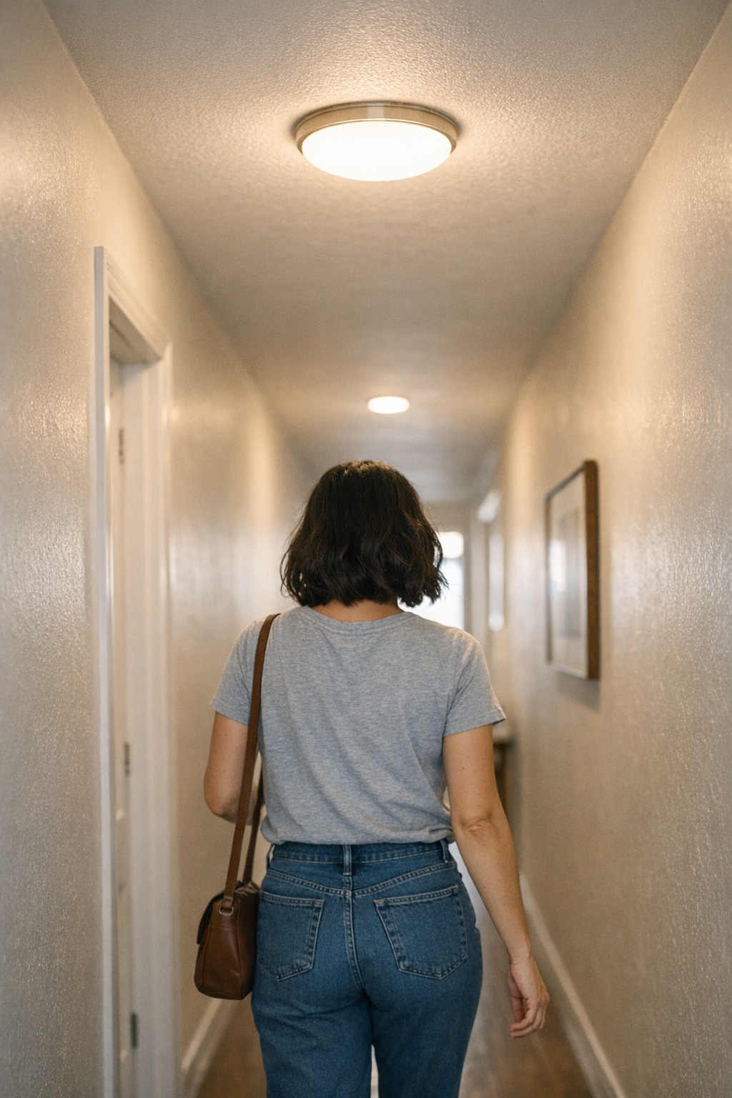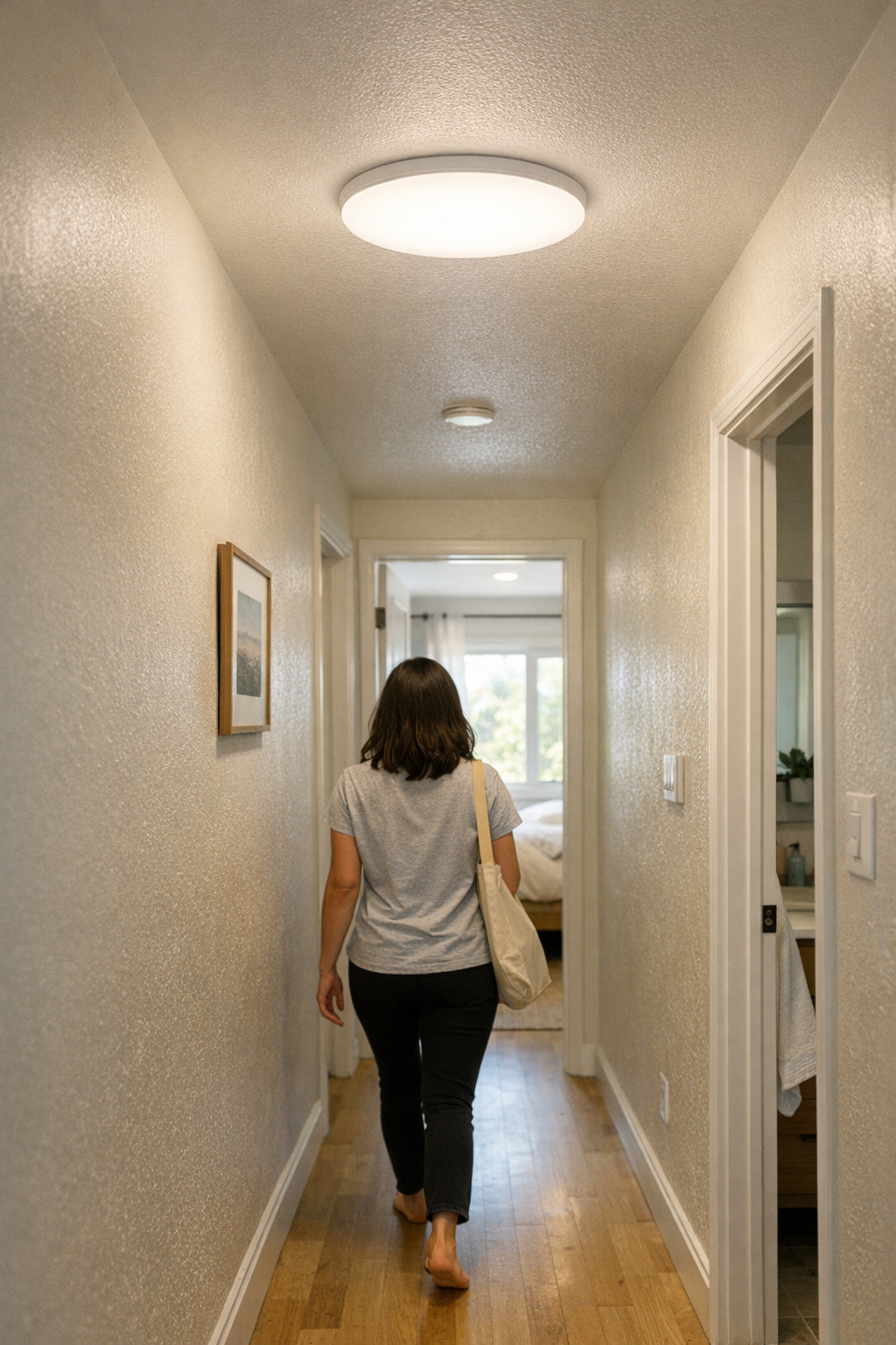 By midday, traffic in the narrow space becomes purposeful—maybe smoothing out a hallway runner rug, organizing shoes, or preparing for guests arriving soon. The flush mount light does not draw attention or cause awkward shadows, allowing the space to stay visually calm and functional. The fixture becomes “invisible” in the best way possible, part of the background rather than an obstacle or focal point.