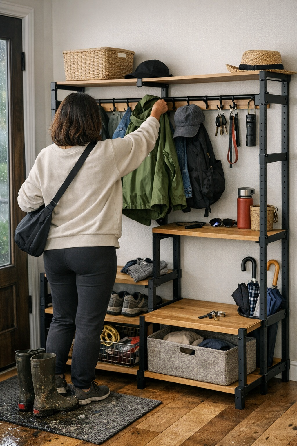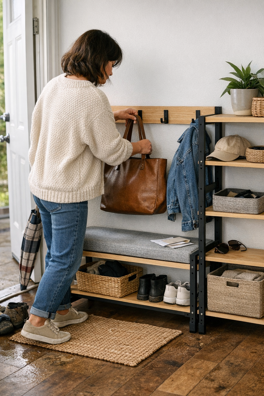 Most entryway solutions fail during stress, not during setup. When your hands are full, the dog’s leash tangles, and the door sticks, do your things return smoothly, or is “putting away” another mini project? The closed bin swallows gloves until none are matched in a hurry; the stylish bench traps a week’s worth of mess. By Thursday, umbrellas are still missing in action—and one muddy pair of boots blocks the entire space. The patterns are clear: if your system needs two steps just to return something, that “later” pile is only going to grow. Quick access and direct return flow determine whether the area works for the actual family cycle, not just during Sunday resets.