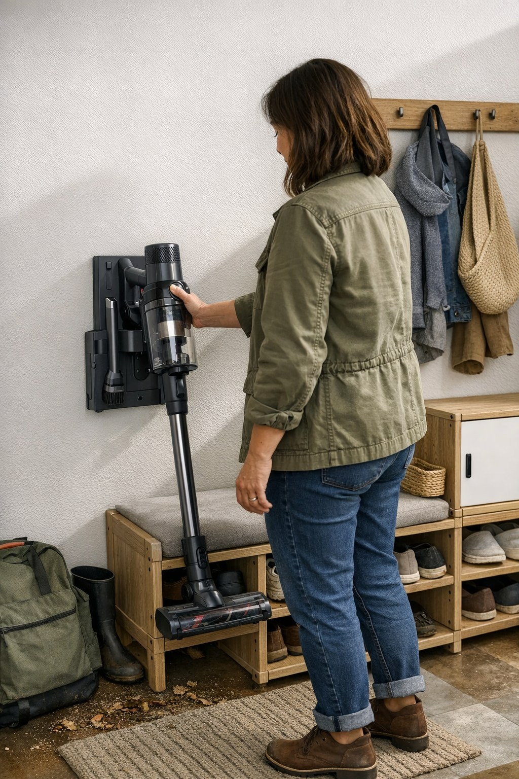 Only a slim, cord-free vacuum dock survives the real test: daily demand in tight, high-traffic entryways. Mount it at standing height, just next to but never blocking the bench. The best setup is always “in reach, out of the way”—present enough to become part of your return and departure routine, but never so prominent that movement gets pinched or pathways tighten and clog after a few arrivals.
