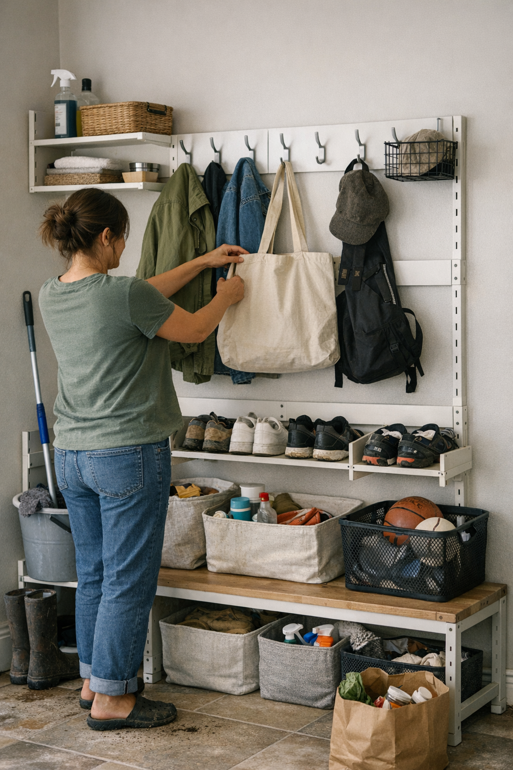 Storage isn’t universal—routine differences expose weak systems. What can look “organized” in a photo rarely fits the mixed flows of real use, especially when several people are coming and going. Wall-mounted racks free up floors, but if they’re set too high or the sections are vague, people bypass them. Drop zones blur: a bag lands on the bench instead of a hook, a muddy boot gets left on the edge instead of the shoe slot, and slowly everything creeps toward the easiest open surface. The moment three categories hit the room at once—mop bucket, school stuff, muddy gear—your original plan collapses into catchall chaos.