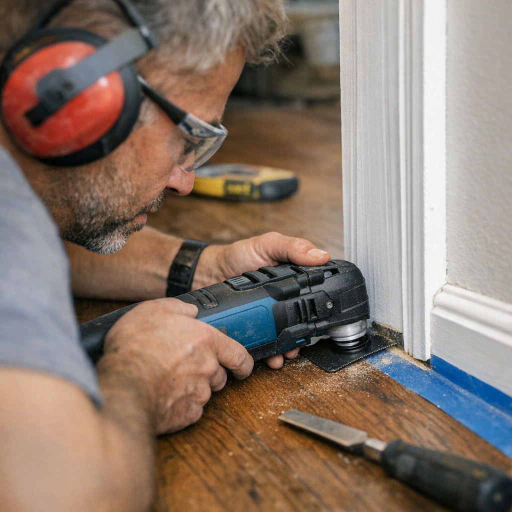One of the most common challenges is trimming baseboard or molding flush against floors or uneven surfaces. Traditional saws often cannot fit, and handsaws risk damaging floors or walls. Using an oscillating multitool with a fine-toothed flush cut blade allows you to trim precisely, leaving the paint and adjacent surfaces intact.